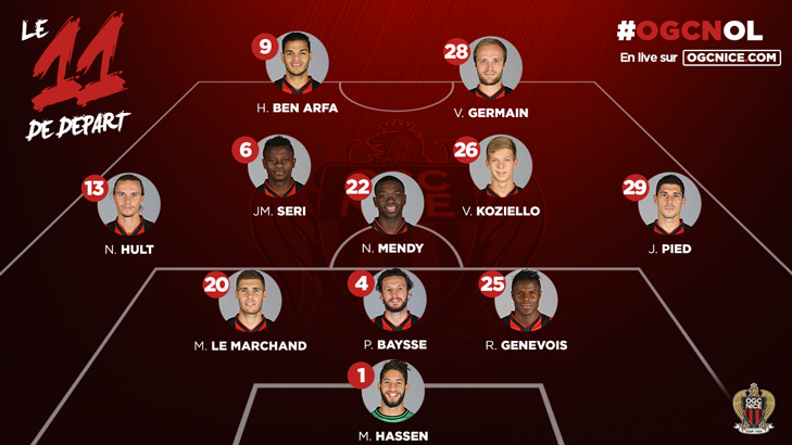 Alors que la 14e journée de L1 débute à 20h30, la composition de départ du Gym vient de tomber. A l'occasion de ce duel face à Lyon, actuel 2e de L1, Claude Puel a fait confiance à un dispositif qu'il avait déjà expérimenté cet été : le 3-5-2. Alors que la défense centrale sera composée du trio Genevois – Baysse – Le Marchand, Niklas Hult fêtera sa première titularisation de la saison, et aura tout le couloir gauche à couvrir. Jérémy Pied sera le pendant du Suédois sur l'aile droite. Par ailleurs, le trio du milieu (Koziello – Mendy – Seri) ne varie pas, tout comme la doublette offensive composée de Valère Germain et Hatem Ben Arfa.