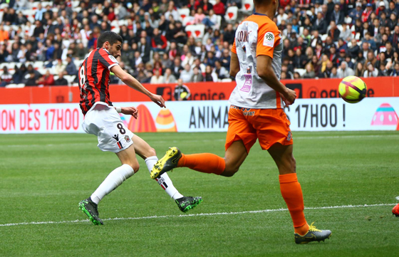 An average first quarter of an hour, and then a good half an hour pretty much sums up Nice’s first half. Slightly shaken from the get go by MHSC but were able to stand firm thanks to an excellent stop from Benitez, denying Delort’s volley (14’). Le Gym then progressively took control of the game before the break, showing impressive authority in their individual battles. Something that was demonstrated by Lamine Diaby-Fadiga, who was dominated by Hilton at the start of the game, before dominating the veteran as the half went by. With his physical strength, the 18 year old put in an excellent performance up-front. Around him, Le Gym showed positive movement and pace, with an energetic and technical Bassem Srarfi on the right wing being a perfect example of this (after starting on the left).