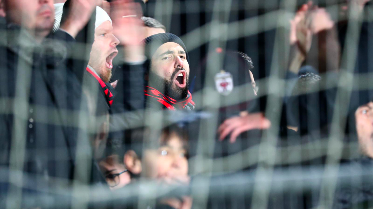 The visiting fans sang their hearts out even though their team was behind.