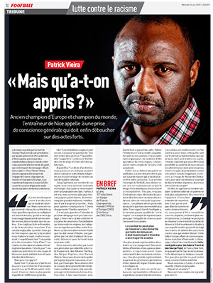 Guest columnist in the French sports daily L'Equipe on Wednesday, OGC Nice coach Patrick Vieira wrote a heartfelt editorial calling for unified action in the face of all forms of discrimination, a truly global pandemic.