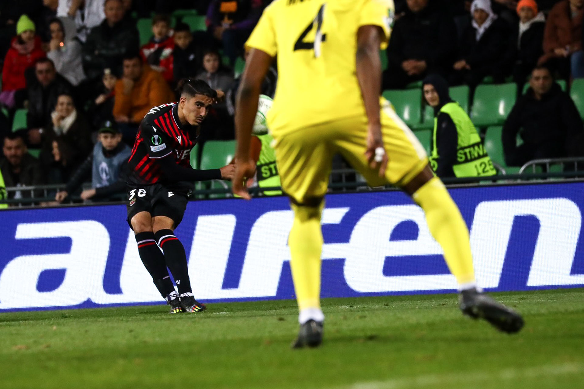 The breakthrough came from an unexpected source with virtually the last kick of the half. Khephren Thuram played the ball out wide to Ayoub Amraoui. The 18-year-old full-back saw his cross-cum-shot finish in the far top corner for a spectacular maiden first-team goal on his European debut (45+1') fewer than two weeks after making his Ligue 1 debut in the derby with Monaco.