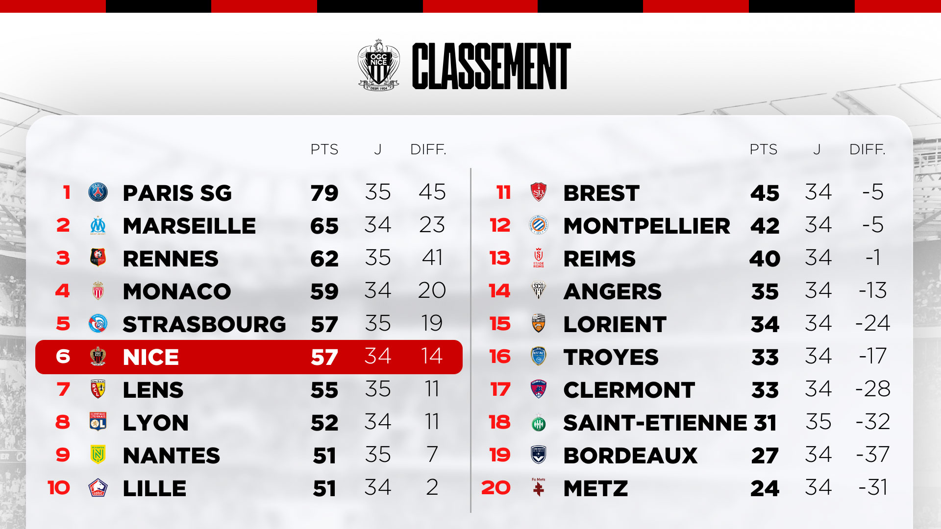 :Si le Gym possède un bon bilan à l'extérieur (voir ci-dessous), voilà trois mois que l’OGC Nice n’a plus gagné hors de ses bases. C’était à Metz (0-2) le 23 janvier. C’est aussi la dernière fois que le Gym a enchaîné deux succès d’affilée en Ligue 1, après avoir gagné contre Nantes la semaine précédente (2-1).