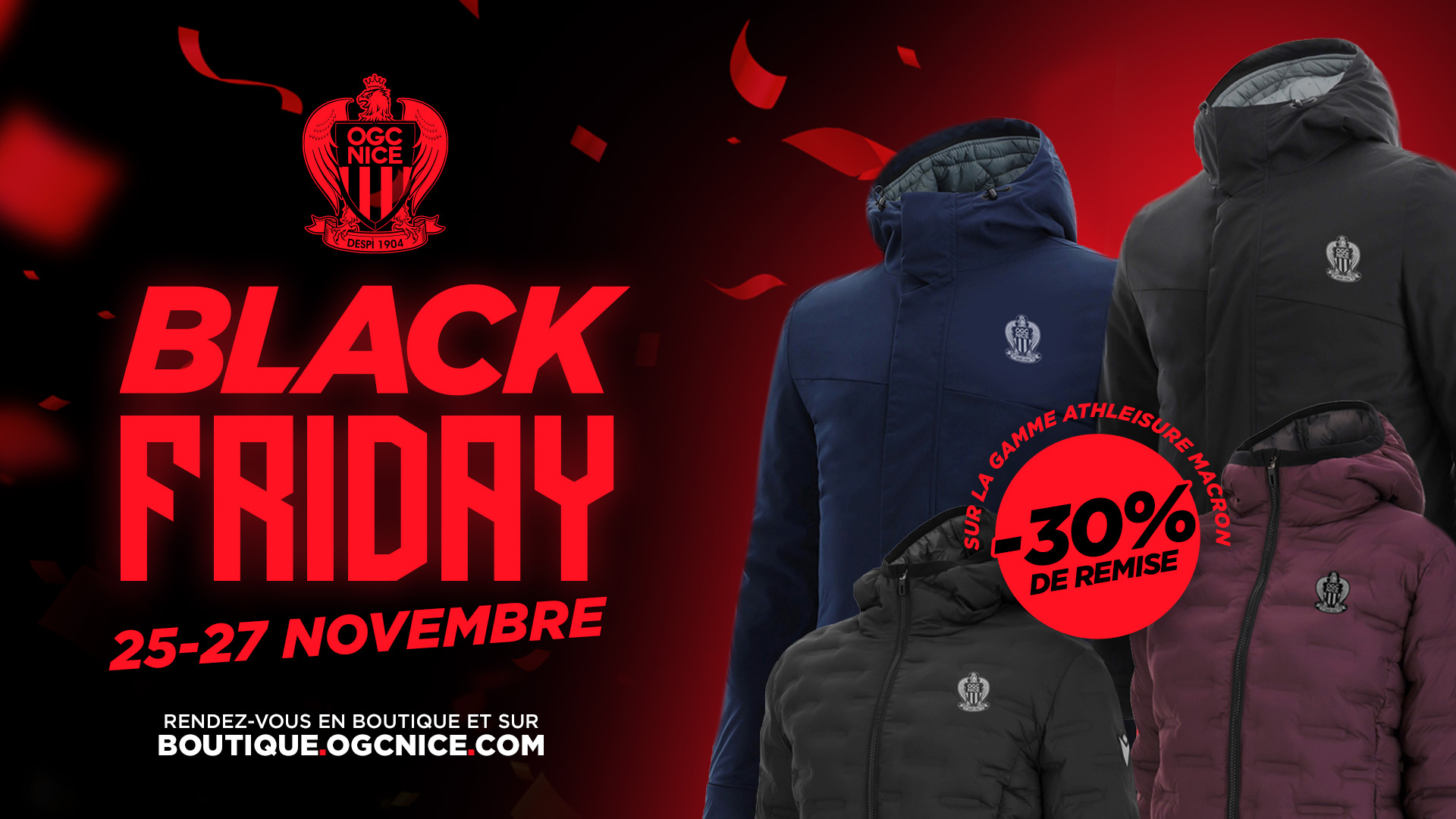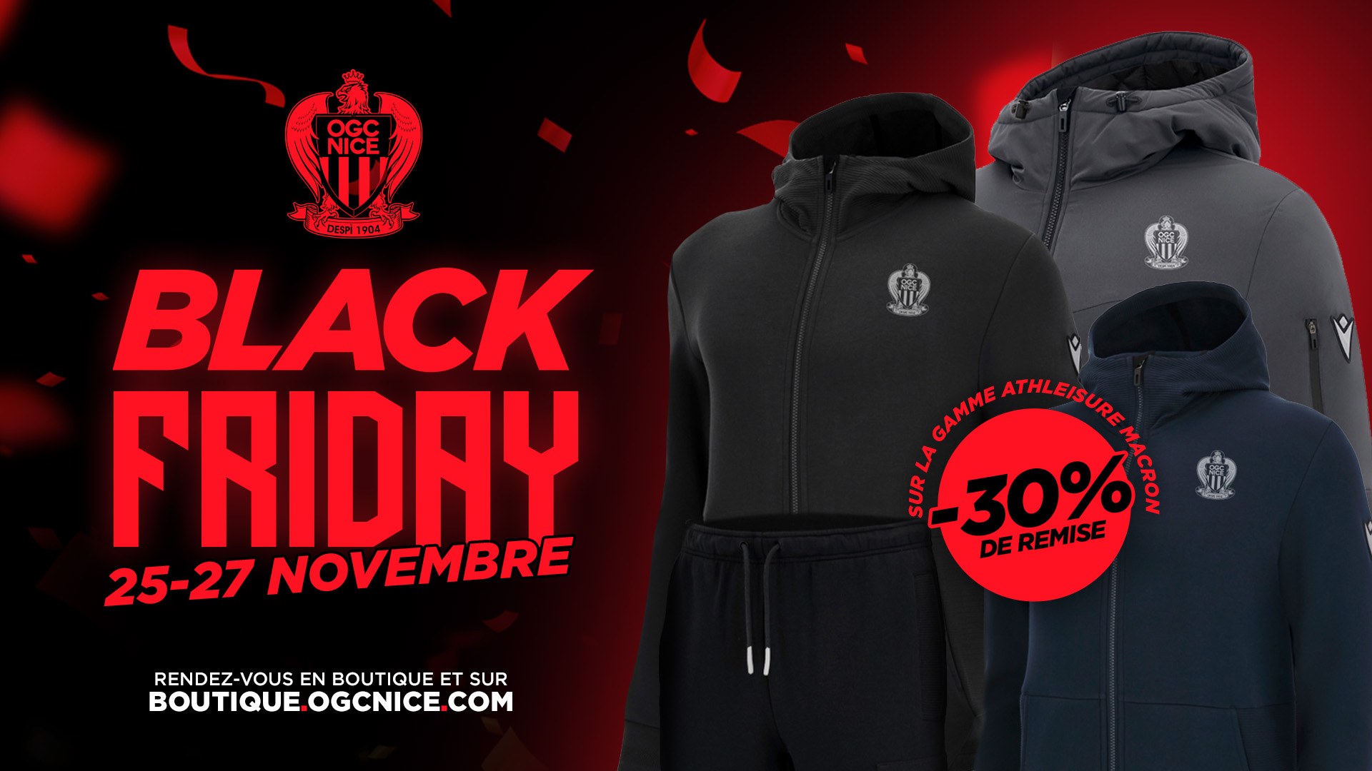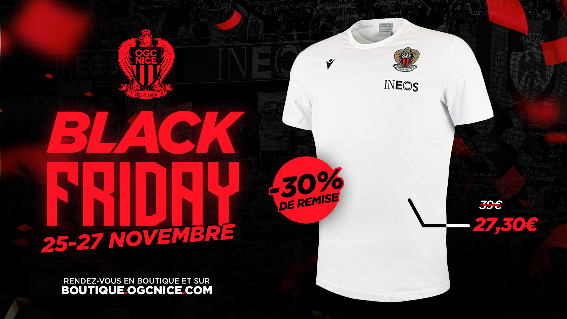 Jusqu'à ce samedi (19h) place Masséna, ou jusqu'à dimanche minuit sur la boutique en ligne, bénéficiez de remises jusqu'à -40% sur toute une sélection de tee-shirts, vestes, survêtements, casquettes...