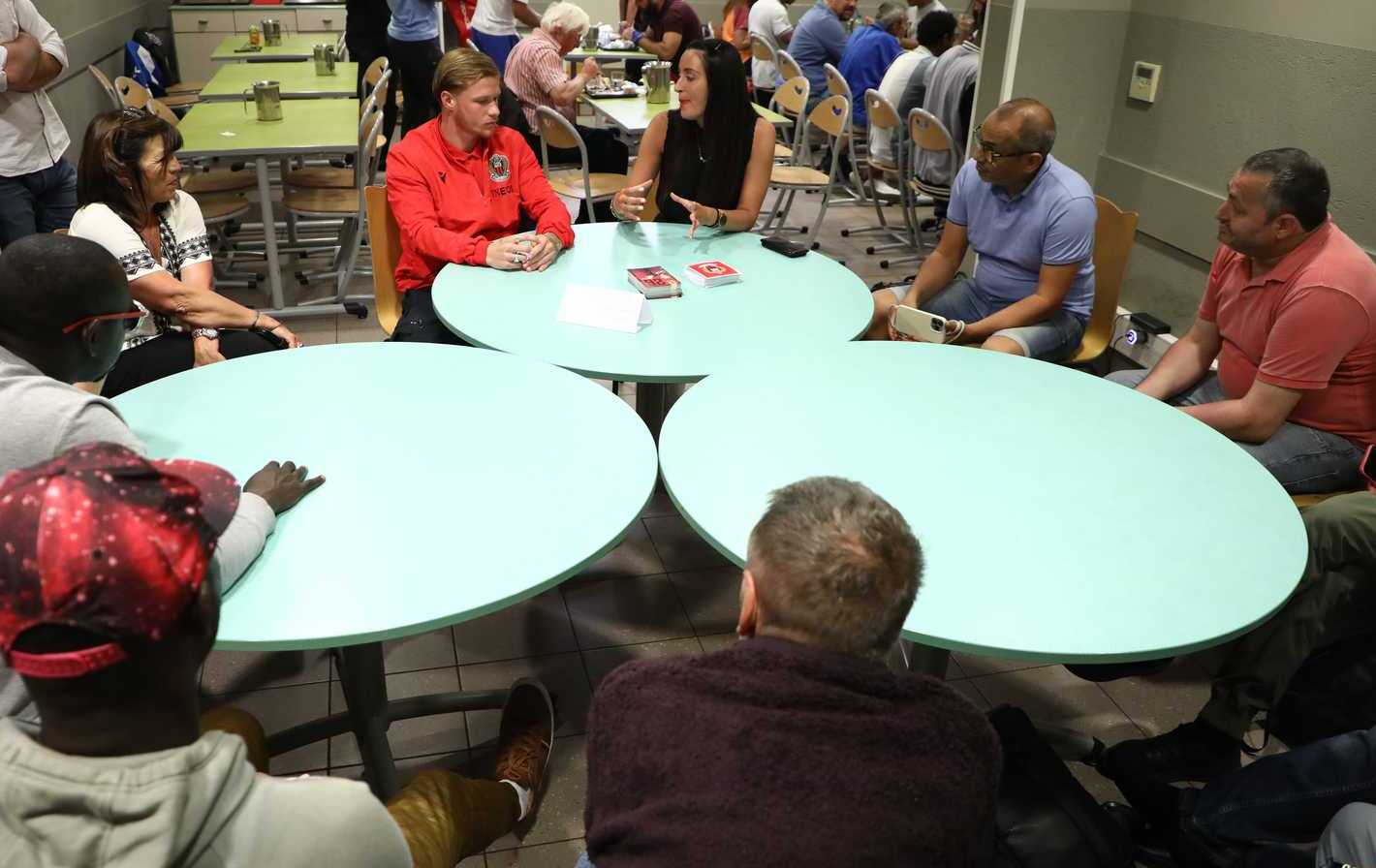 Au programme, une rencontre avec une dizaine d'hébergés, pour la plupart fans du ballon rond, et une session de questions / réponses autour de la carrière du latéral gauche rouge et noir, ses inspirations et sur le métier de footballeur. Le numéro 26 du Gym a ensuite pris des photos et signé des autographes.