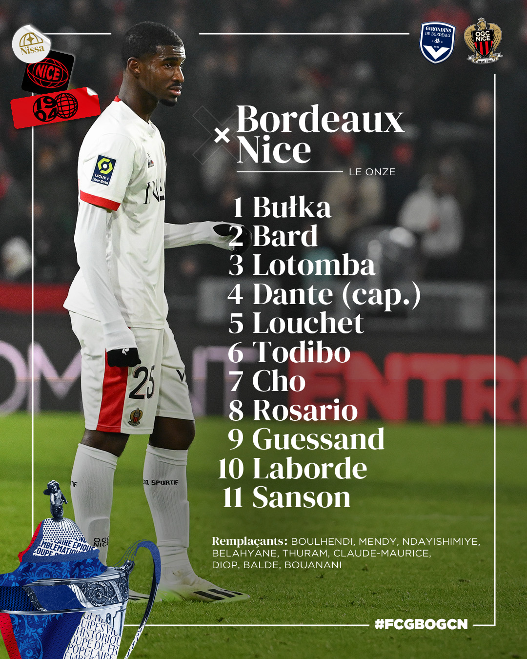 Voici la composition d'équipe de Francesco Farioli pour défier les Girondins en 16e de finale de la Coupe de France. Coup d'envoi à 17h30 au Matmut Atlantique !