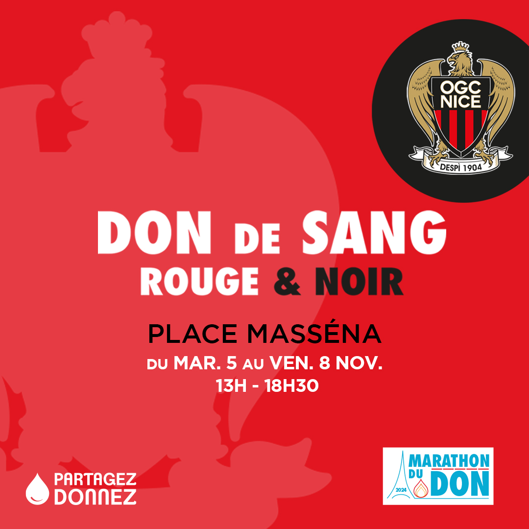 L’OGC Nice mobilisera la grande famille Rouge & Noir tout au long de la semaine. Les jeunes joueurs du Centre de Formation, joueuses de l’équipe D2 Féminine, entraîneurs, Anciens Aiglons et salariés du Gym se rendront sur place pour donner leur sang et tracter auprès des passants aux côtés de l’association étudiante HumaNice. L’Union Départementale des Donneurs de Sang bénévole des Alpes-Maritimes et les associations locales, accompagneront les donneurs pendant leur parcours de don. La protection civile animera des séances d’initiation gratuite aux gestes de premiers secours. La Ville de Nice et la Métropole de Nice Côte d’Azur apporteront leur soutien logistique et communiqueront sur la collecte auprès des Niçois aux côtés des partenaires médias Nice Matin, BFM TV Nice et France Bleu Azur. Après le don, l’EFS proposera une pause gourmande avec des douceurs sucrées et salées pour permettre aux donneurs de reprendre un maximum d’énergie. Chaque donneur se verra remettre un dossard de participation au « Marathon du don ».