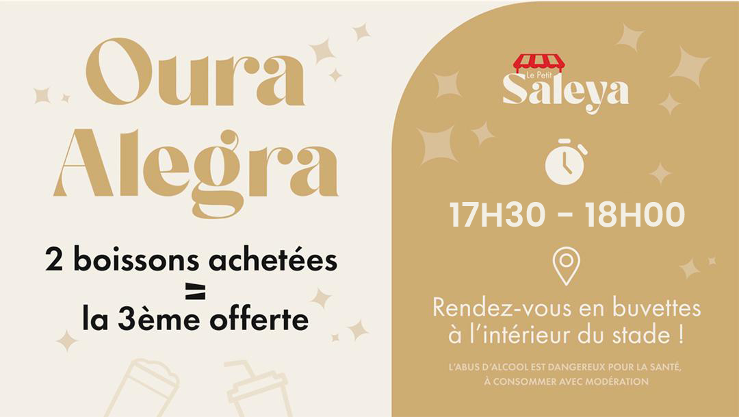 Et entre 17h30 et 18h00, profitez de notre Oura Alegra : 2 boissons achetées dans les buvettes in-stadia, la troisième offerte !