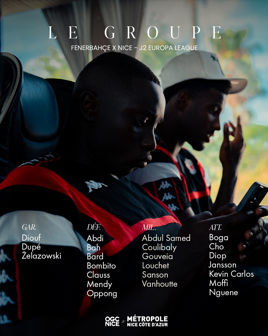 Ce jeudi, l'OGC Nice défie Fenerbahçe à l'occasion de la 2ème journée d'Europa League (coup d'envoi à 18h45 - heure française). Voici le groupe retenu par Franck Haise pour ce déplacement à Istanbul.