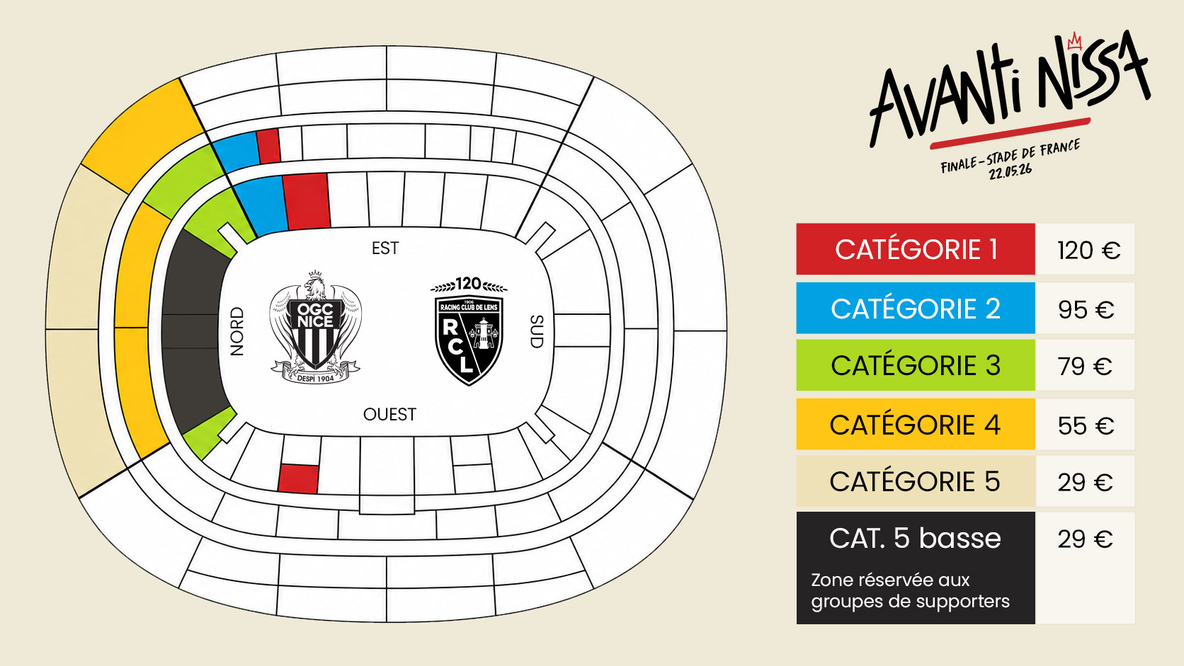 Alors qu’il lui reste 3 matchs capitaux pour aller chercher son maintien en L1 (contre Lens, Auxerre et Metz), l’OGC Nice ira défier le RC Lens en finale de la Coupe de France Crédit Agricole, vendredi 22 mai à 21h. Après un premier point effectué dans le sillage de la qualification, voici de nouvelles informations importantes destinées au peuple rouge et noir qui prendra la direction du Stade de France.
