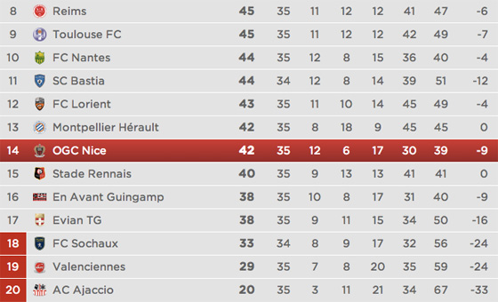 Si les Doubistes s’inclinent ce dimanche contre Paris, à Bonal (14h), l'avance des Rouge et Noir restera de 9 points. L’OGC Nice serait alors maintenu à 99%, à moins d’une improbable inversion de la différence de buts (-9 pour Nice et -24 pour Sochaux) lors des trois dernières rencontres.