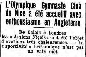 19 mars 1922. L’OGC Nice s’incline 3-1 contre le Cuirassé Thunderer. Le premier match de l’histoire de l’OGC Nice contre une équipe anglaise. Et encore, il ne s’agit pas vraiment d’un club. En effet, dans les années 1920 et 1930, les navires anglais qui faisaient escale à Villefranche demandaient à jouer contre le Gym. Sur ce principe, Nice a disputé douze matchs contre les hommes qui se trouvaient sur des bateaux britanniques. Il faut attendre le 18 mai 1933 pour voir l’OGC Nice affronter une « vraie » formation, à savoir Bristol (victoire 3-1) et quelques mois encore pour que les Aiglons soient invités outre-Manche (photos ci-dessus).