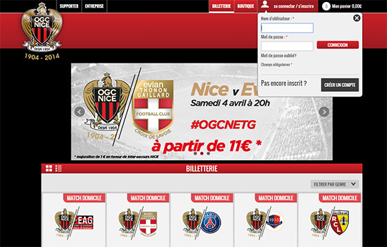1- Rendez-vous sur http://billetterie.ogcnice.com. Puis connectez-vous avec vos identifiants habituels dans la partie supérieure de la page, ou créez-vous un compte si vous n'êtes pas encore inscrit.