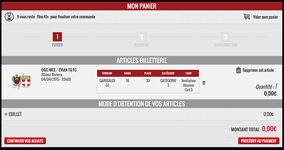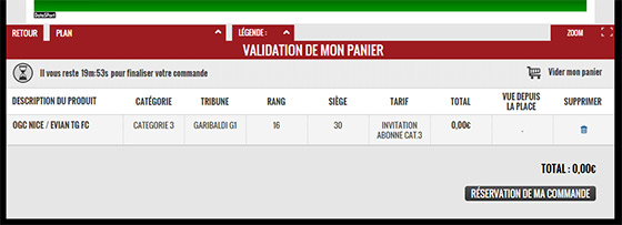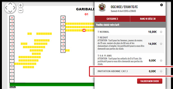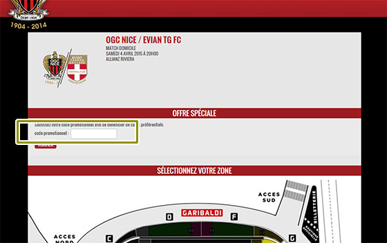 2- Après avoir choisi le match NICE - EVIAN ou NICE - CAEN, saisissez dans la case code promotionnel votre numéro d'abonné (figurant sur votre carte 2014-15) et cliquez sur VALIDER.