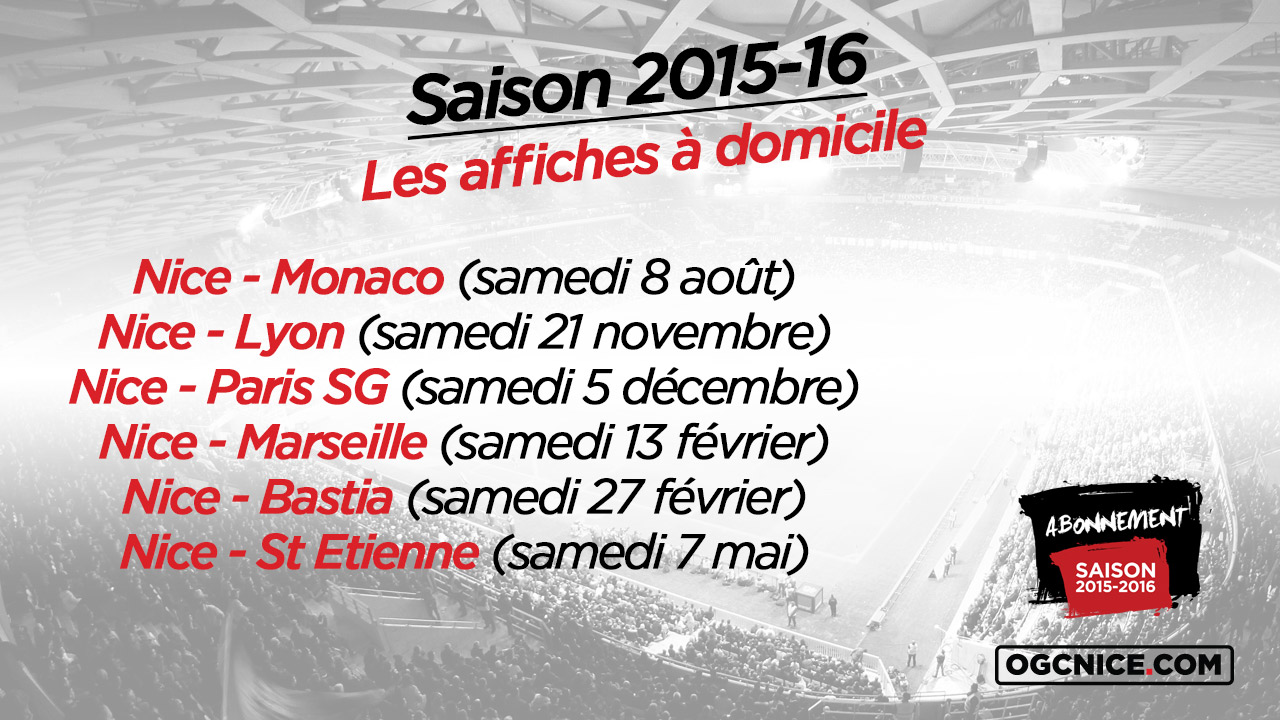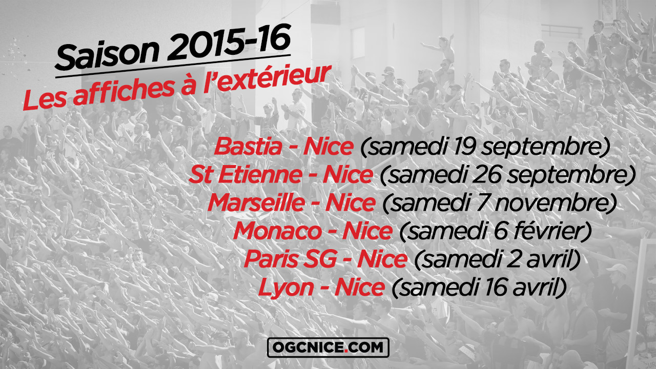 Qu’est-ce qu’une affiche ? Les rencontres face au top 5 (Paris SG, Lyon, Monaco, Marseille, St Etienne), et, dans le cas de Nice, le derby face à Bastia. Ces soirées de « gala » sont également réparties dans le calendrier 2015-16. Trois déplacements et trois réceptions en 2015. Et naturellement la même chose en 2016.