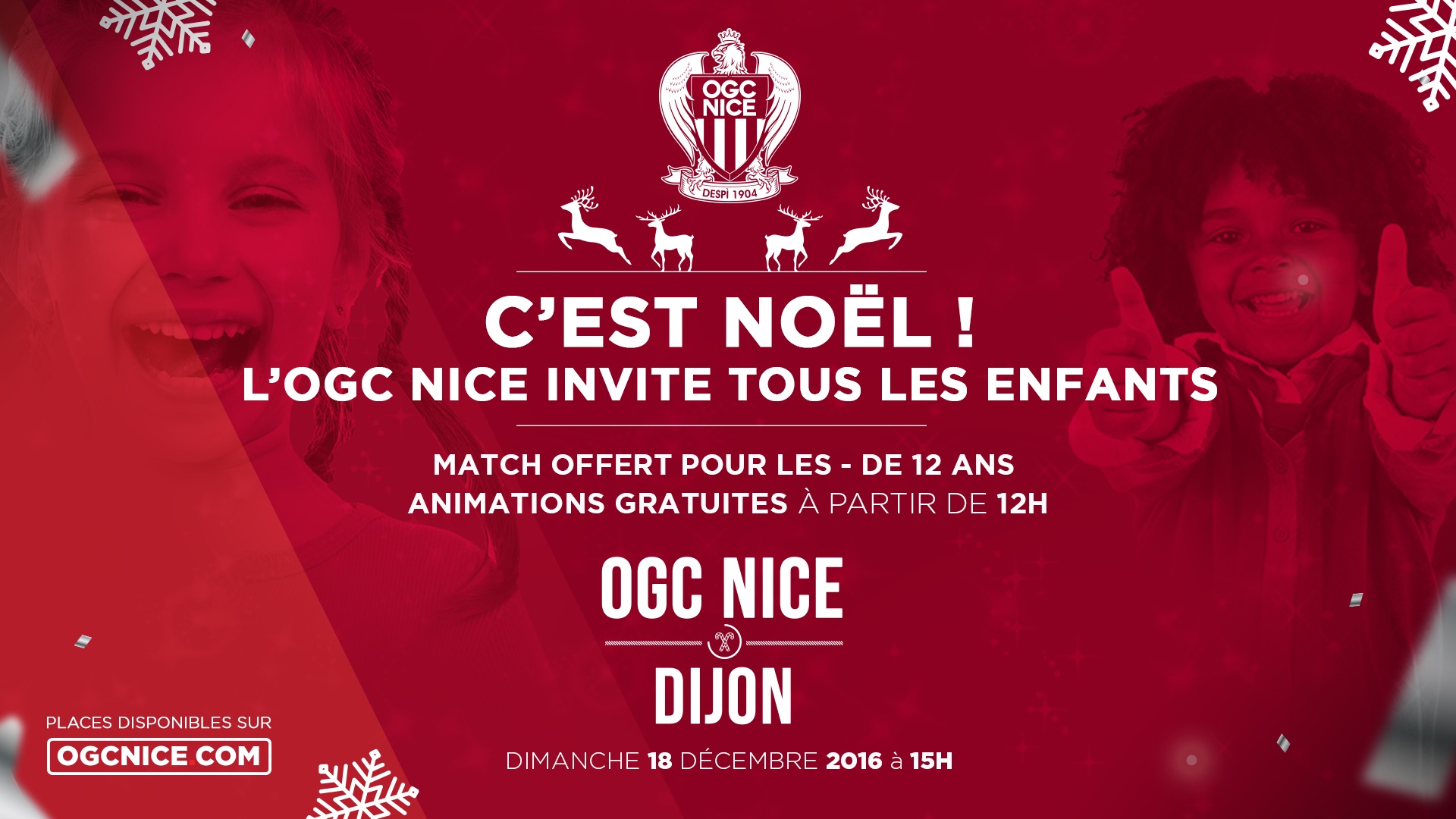 L'OGC Nice offre les places pour les enfants de moins de 12 ans lors de la rencontre face à Dijon, fixée au dimanche 18 décembre à 15h00. Avant Noël, l'ambiance s'annonce festive pour la der' de l'année 2016 à l'Allianz Riviera.