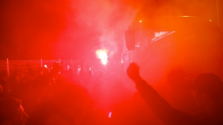 Une clameur, au loin. Puis le bruit des chants, de plus en plus puissants. Et enfin la lueur des fumigènes illuminant la nuit. Alors qu'ils se rapprochaient de leur point d'arrivée, les Aigons prirent progressivement la mesure de l'accueil qui les attendait, à 2h30 du matin.