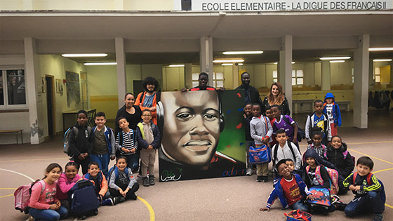 En conclusion de ce moment intime et privilégié, les éducateurs d’ADAM et les écoliers avaient réservé une belle surprise au jeune Aiglon. En effet, un portrait en peinture de Malang sur une toile géante l’attendait dans la cour de l’école. Un geste qui l’a beaucoup ému.