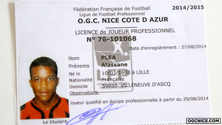 Voici la première licence d'Alassane Plea, qui dispute actuellement sa 4e saison en rouge et noir. Arrivé à 21 ans, l'attaquant formé à Lyon a bien grandi : il a inscrit 30 buts lors de ses 97 matchs toutes compétitions confondues avec le Gym.