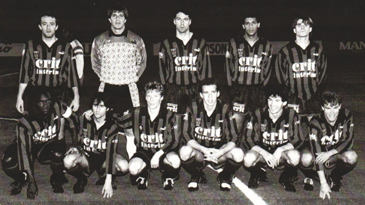 Sochaux - Nice, le 24 mars 1990. Debout : Mattio, Morisseau, Bonnevay, El Haddaoui, Elsner. Accroupis : Bocandé, Mazzuchetti, Langers, E.Roy, P.Soler, J.-P.Rohr.