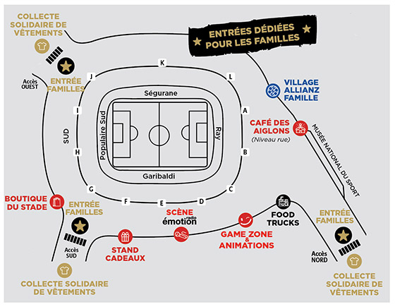 Le parvis ouvrira ses portes 2h avant le premier coup de sifflet de ce Nice - Lille. De quoi permettre aux spectateurs de profiter du village Allianz Famille, des food trucks, des structures gonflables et de la Game Zone au nord.
