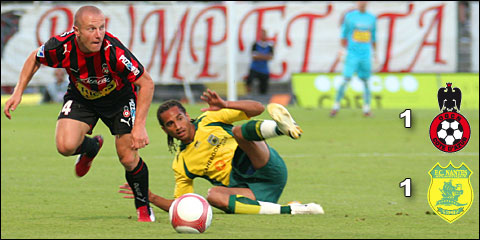 Au coup de sifflet final de M. Duhamel, les aiglons pouvaient être déçus. Certes, ils auront réussi à se racheter de leur piètre sortie mancelle. Mais, à trois minutes près ils laissaient échapper une victoire qui leur tendait les bras. D'entrée de jeu les hommes d'Antonetti avaient fait le nécessaire. Dès la deuxième minute un corner de Rool était dévié par Moussilou et repris par Varrault dans les six mètres... au-dessus ! Le Gym, emmené par un Florent Balmont aux quatre poumons et un Marama Vahirua toujours motivé à l'idée d'affronter son club formateur domine largement les débats. Les coups francs et corners se multiplient, mais ils trouvent sur leur route le vigilant gardien serbe Stojkovic.Nice tente alors de jouer dans la profondeur. A la 25è, Koné, discret jusque là, accélère, prend de vitesse toute la défense nantaise et frappe. Stojkovic repousse, Baky reprend à nouveau... encore contré ! L'OGCN fait bien circuler le ballon mais ne trouve pas la solution.