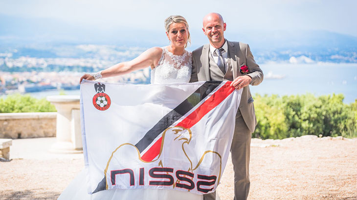Faire-parts, dragées, (fameux, très fameux...) bouquet de la mariée, déco, lieu, plan de table : tout a été décliné autour du thème « OGC Nice ». Tout a été surprenant et couronné de succès.