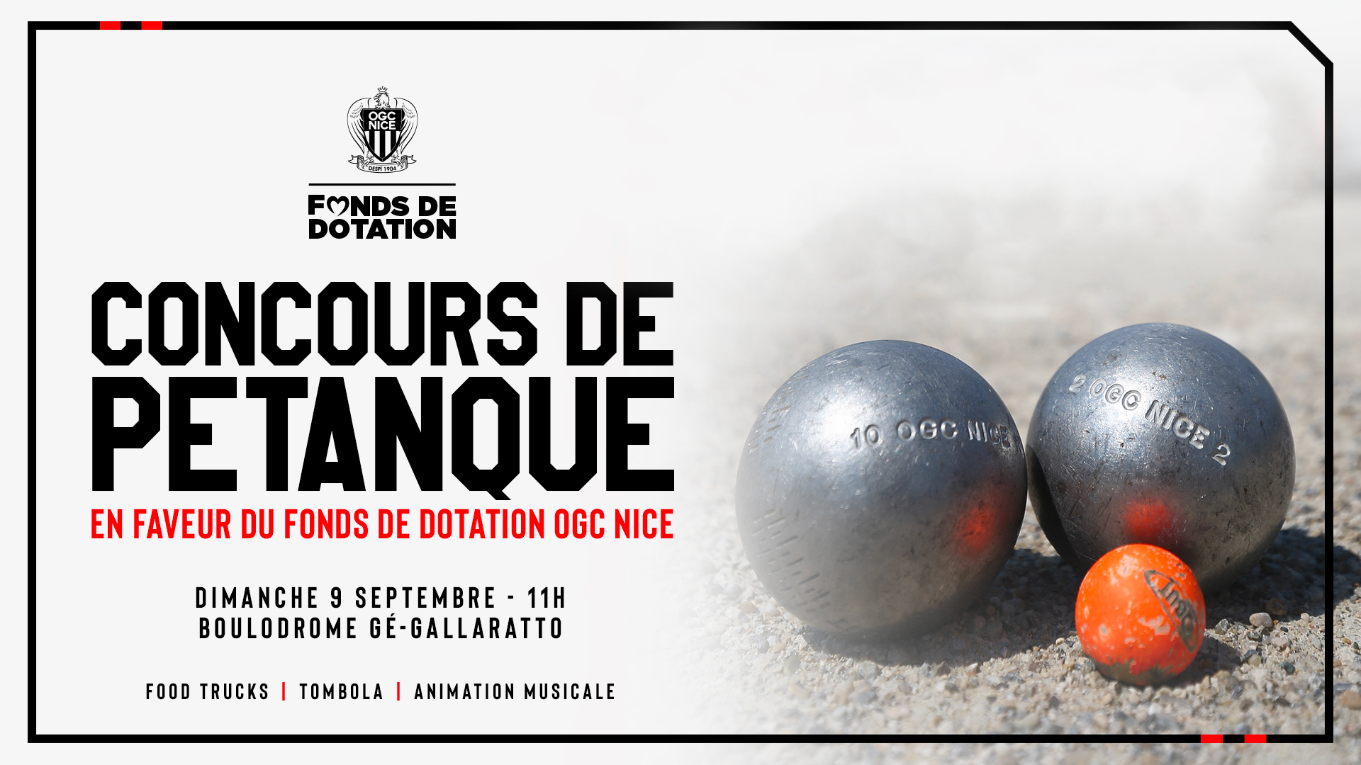 Vous serez plus de 160 triplettes à venir partager une journée festive et placée sous le signe de la solidarité ce dimanche, à l’occasion du concours de pétanque organisé en faveur du Fonds de Dotation de l’OGC Nice. Voici l’ensemble des informations pratiques concernant le concours.