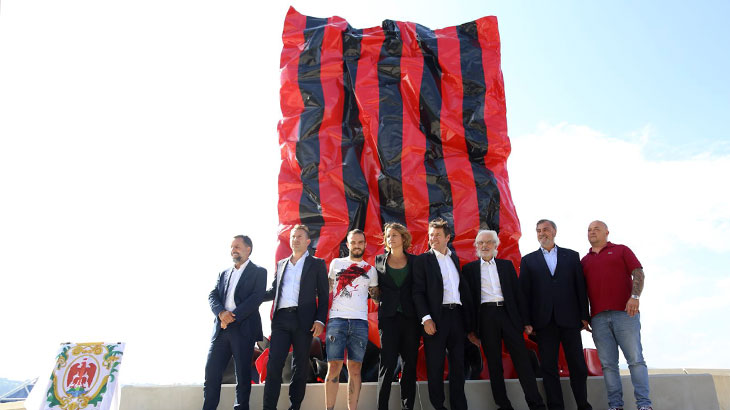Partenaire et complice des acteurs majeurs de « l’Ecole de Nice » (Arman, César, Sosno, et d'autres), l'artiste-plasticien niçois a rendu un magnifique hommage à l'ancienne enceinte du Gym, qui a vu passer des générations de supporters. Haut de 5,5 mètres, son monument rouge et noir a été créé avec l'aide de nombreux artistes niçois, qui ont soudé plus de 30 sièges authentiques du Ray.