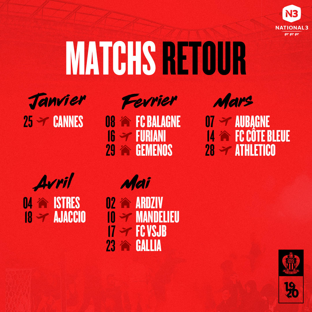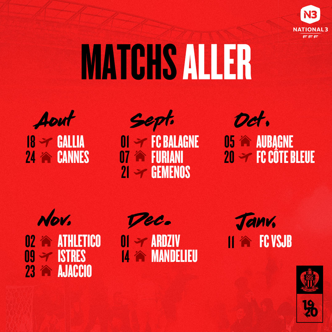 Les jeunes de Laurent Bonadei se rendront sur la pelouse du Gallia de Lucciana, le 18 août, pour ouvrir la saison. Formation corse contre laquelle les Niçois clôtureront l'année footballistique, le 23 mai 2020.