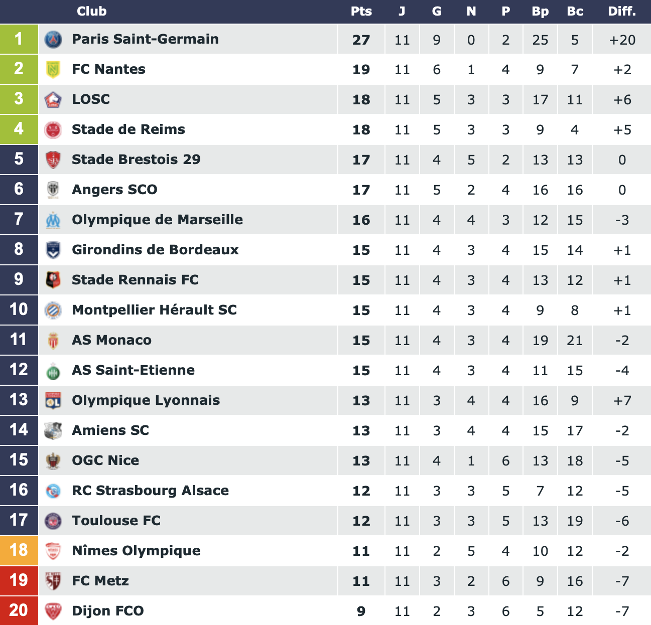 Ce dimanche (coup d'envoi à 17h), le Gym se mesurera au Stade de Reims pour le compte de la 12e journée de championnat. Voici ci-dessous le programme du week-end ainsi que le classement de la Ligue 1 Conforama.