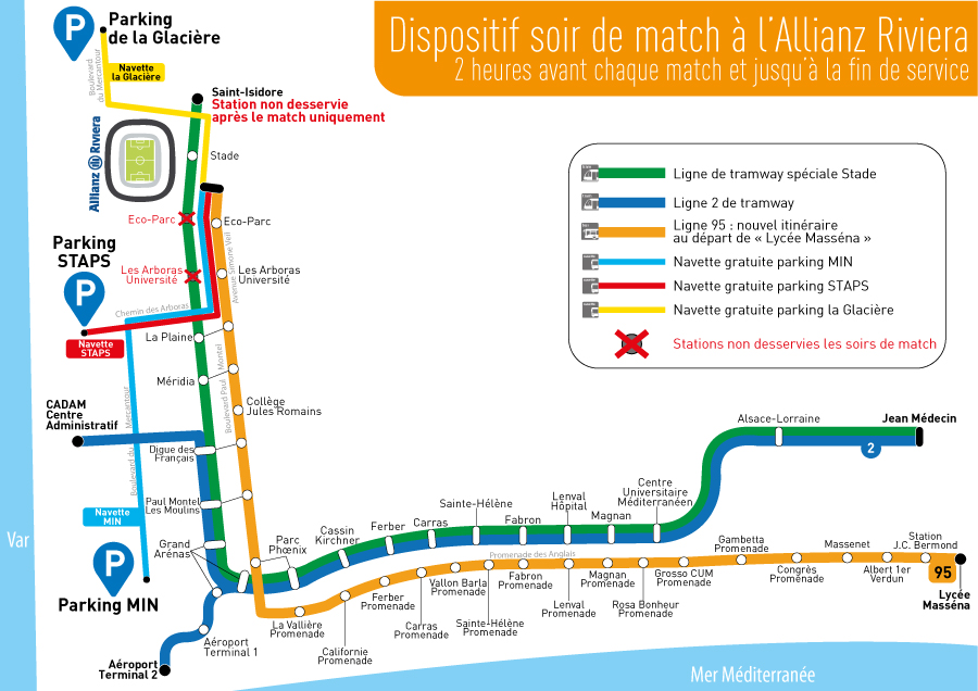 ►A la fin du match, les rames circulent toutes les 4 minutes au départ de la station "Stade" en direction de "Jean Médecin". Les stations "Saint-Isidore" et "Stade" (uniquement direction "Saint-Isidore") sont exceptionnellement fermées. Vous pouvez vous reporter à la station "Stade" direction "Jean Médecin". Les stations "Les Arboras Université" et "Eco-Parc" restent fermées comme à l’aller.