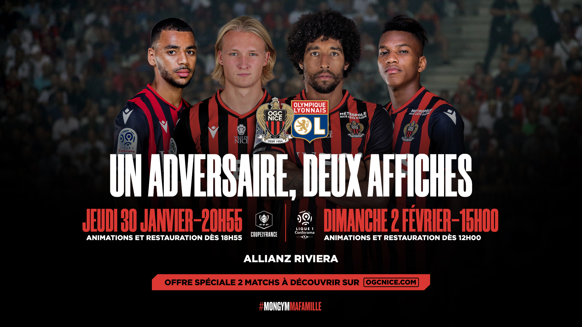 10€ pour tous les abonnés, pack 2 matchs, découvrez nos offres pour la double confrontation avec Lyon (ce jeudi à 20h55 en coupe de France et ce dimanche à 15h en championnat) à l'Allianz Riviera.