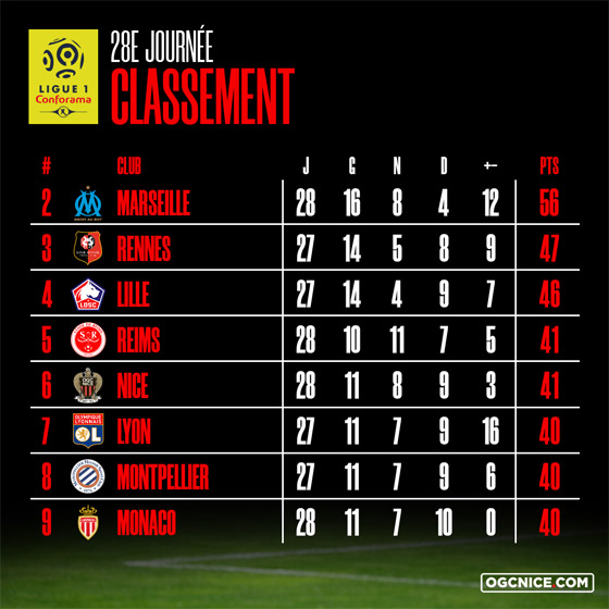 Avec 41 points au compteur, les Rouge et Noir devancent désormais leur adversaire du soir et se positionnent à hauteur du 5e, Reims. Rémois et Niçois ne sont départagés qu'à la différence de but (+5 contre +3).