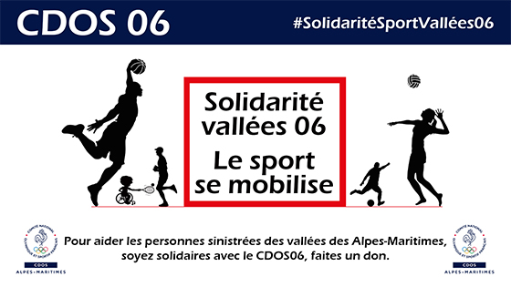 Le Comité Départemental Olympique et Sportif des Alpes-Maritimes a lancé l’opération « Solidarité Sport Vallées 06 » à travers laquelle il appelle le mouvement sportif azuréen à se mobiliser en faveur des sinistrés de nos vallées. Pour cela, une collecte de dons a été mise en place et le CDOS 06 reversera la totalité des fonds en liaison avec le Département des Alpes-Maritimes.