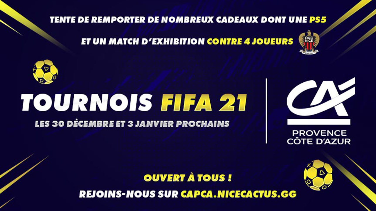 Pendant les fêtes, participez aux tournois E-Sport by Crédit Agricole Provence Côte d’Azur organisés par NiceCactus sur le jeu FIFA 21. À la clé pour les meilleurs, de nombreux lots dont une PS5 et la chance de disputer un match d’exhibition avec 4 joueurs du Gym !