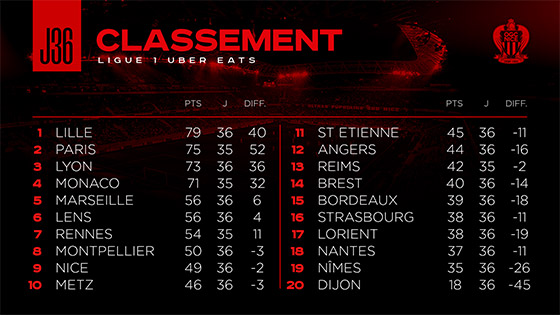 Au soir de la 36e journée, le club rouge et noir est 9e avec 49 points sans que les matchs restants ne puissent lui faire perdre sa position.