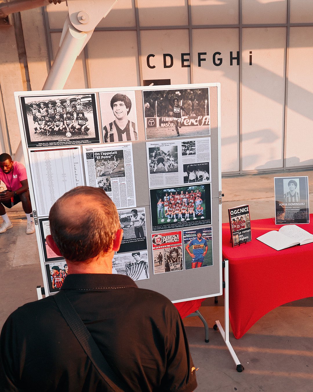 Sur le parvis de l'Allianz Riviera, le stand de l’association La Grande Histoire de Gym rend hommage à Jorge Dominguez, récemment disparu.