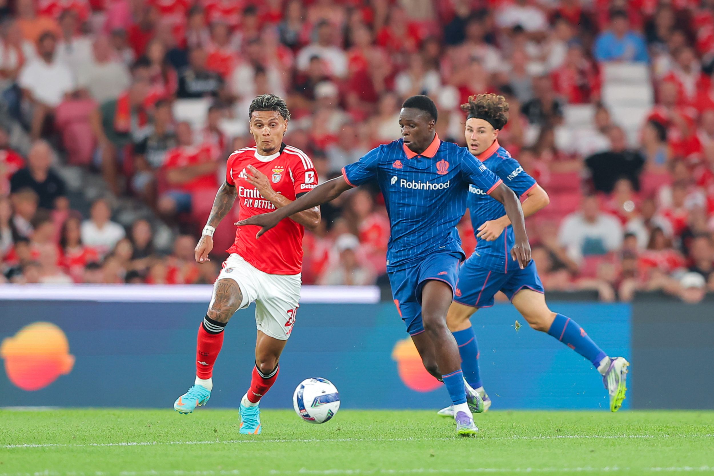 Diminués par une nouvelle absence, celle d'Hicham Boudaoui, fiévreux et indisponible tout comme Dante et Morgan Sanson, qui ont rejoint l'infirmerie après le match aller, les Aiglons ont pourtant démarré la partie pied au plancher. Trouvé sur la gauche de la surface adverse, Melvin Bard, porteur du brassard de capitaine, a vu sa frappe déviée passer à quelque centimètres du crâne de Terem Moffi, devancé de justesse par Anatoliy Trubin, le portier benfiquiste (3e). Sans crainte, la jeune arrière-garde niçoise, composée d'Antoine Mendy (21 ans), Juma Bah (19 ans) et Kojo Peprah Oppong (21 ans) s'est bagarrée dans les duels pour contrer les assauts de la redoutable attaque portugaise.