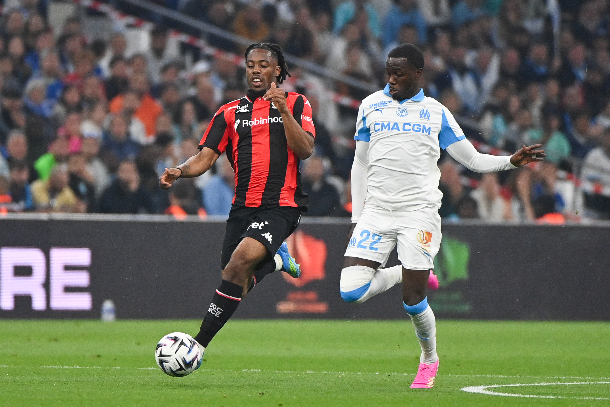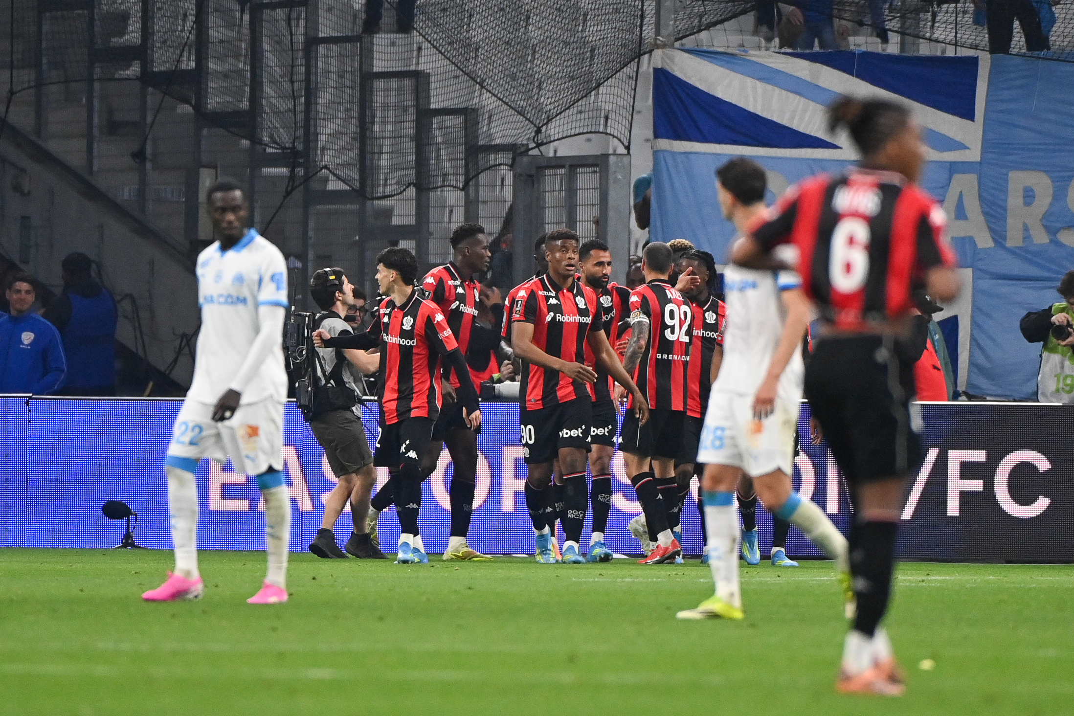 Les choses auraient même pu se gâter au retour des vestiaires lors de cinq minutes bouillantes sur la cage azuréenne : coup de tête de Pierre-Emerick Aubameyang juste à côté (48e), frappe de Tochukwu Nnadi déviée in extremis par Antoine Mendy (50e), tête à bout portant de Leonardo Balerdi (51e)... Les occasions phocéennes ont plu et Yéhvann Diouf a fini par craquer à la 66e minute, lorsque Pierre-Emile Højbjerg, isolé au second poteau, a placé une tête plongeante imparable suite à un centre venu de la droite (1-0, 66e).